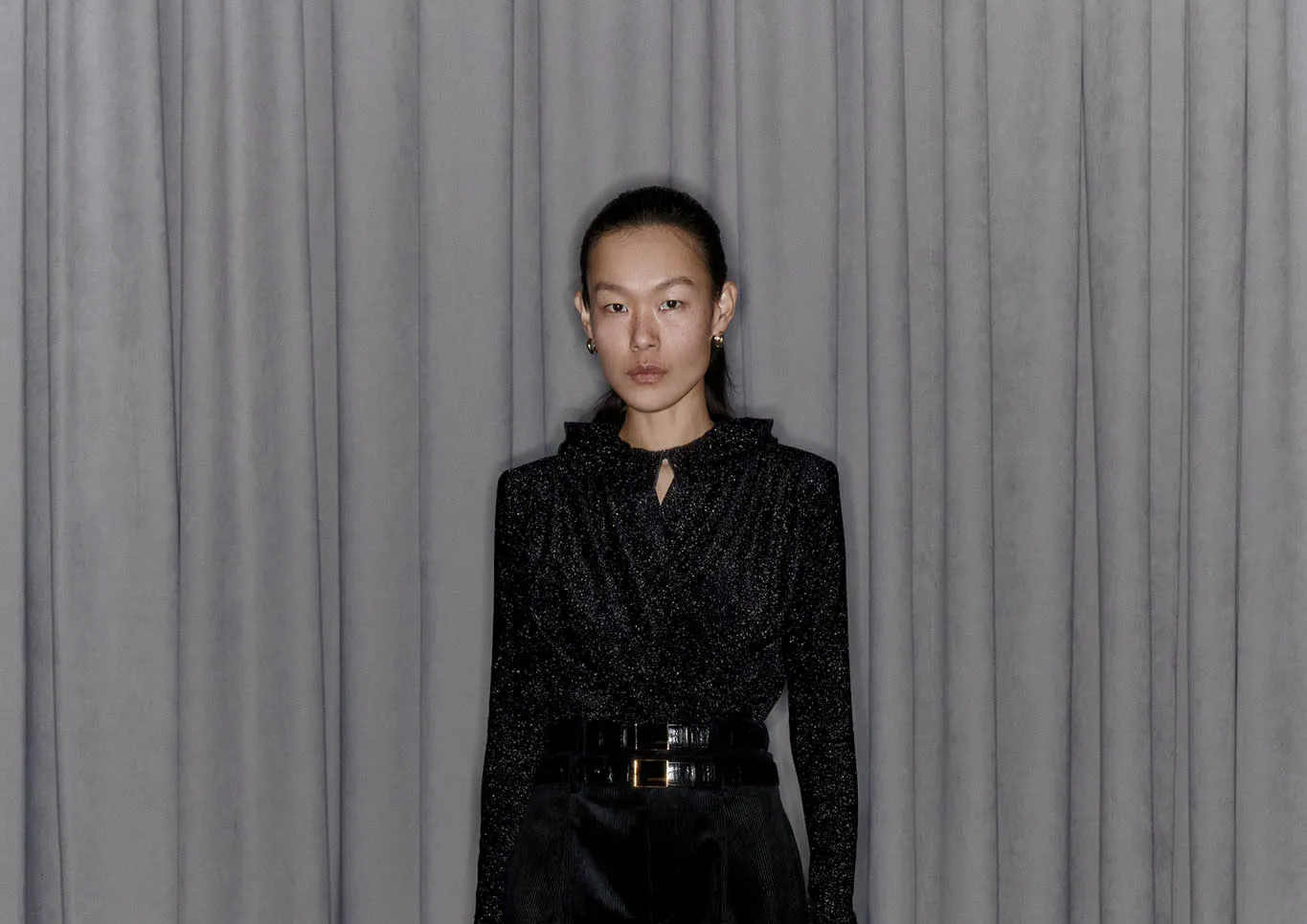 • 極端なプロポーション非常にタイトなトップスに対し、極端にワイドなトラウザーズを合わせる。あるいは、ウエストを極限までシェイプしたジャケット。これらのプロポーションの遊びは、ヘルムート・ラングがかつて追求した「身体の美学」を、よりドラマチックに進化させたものです。